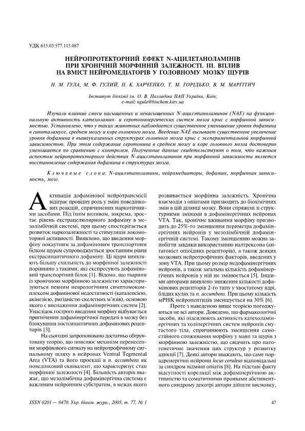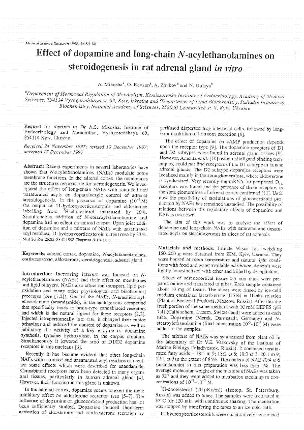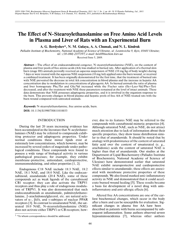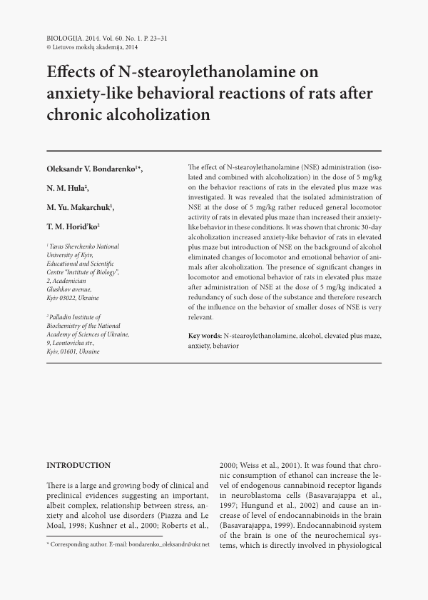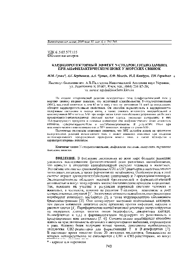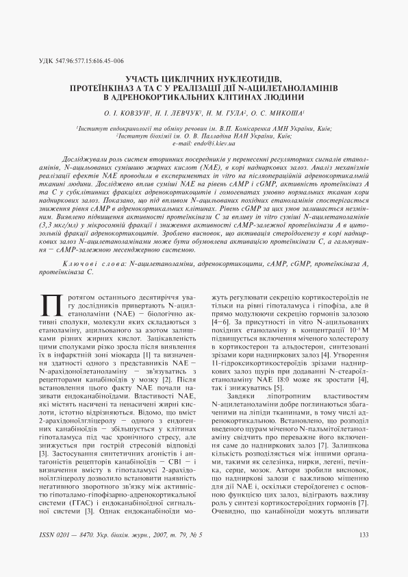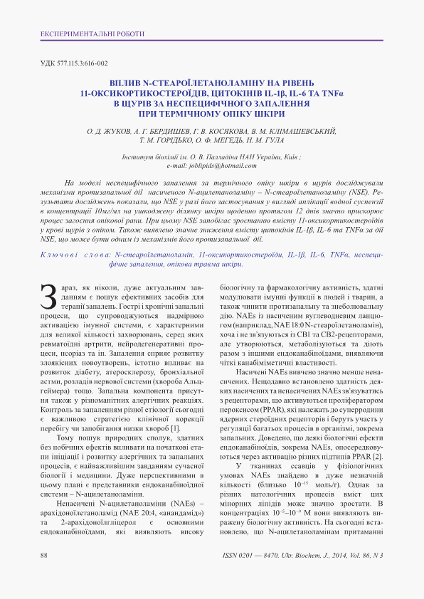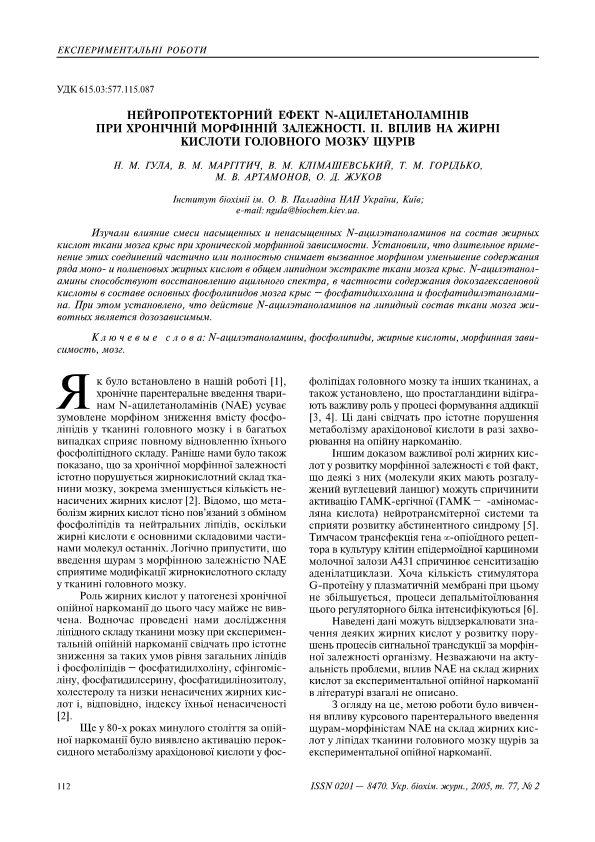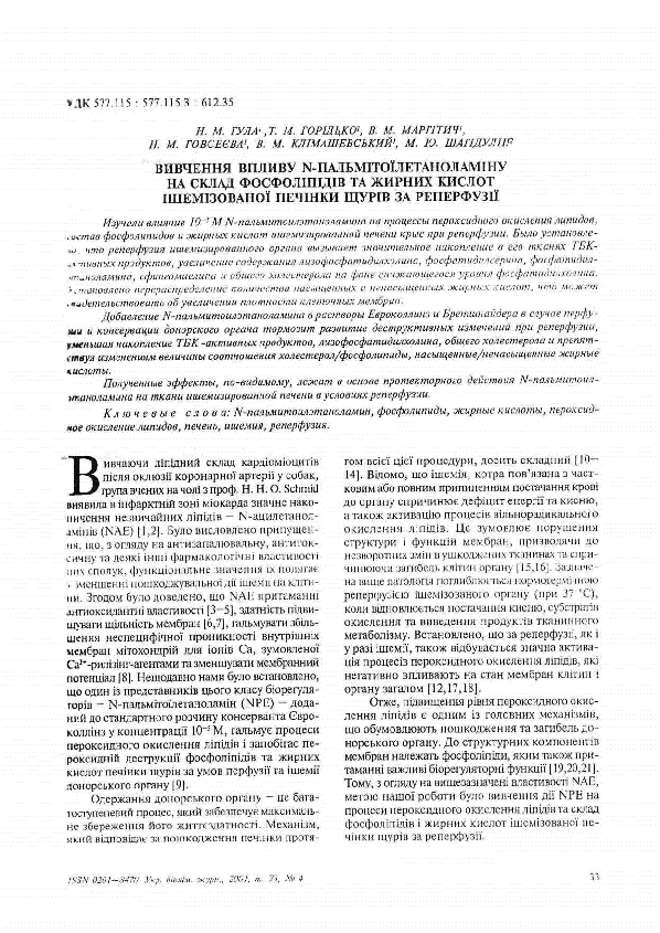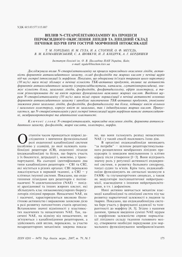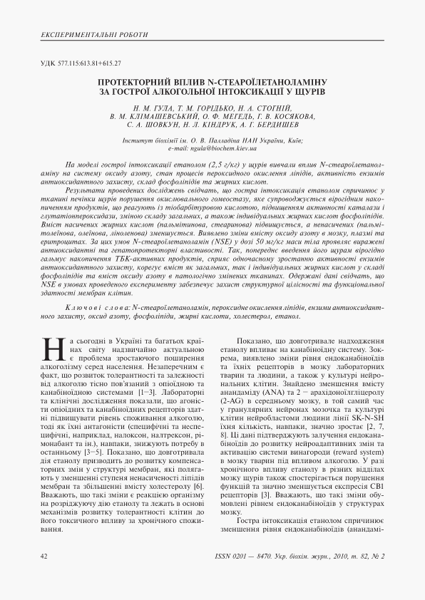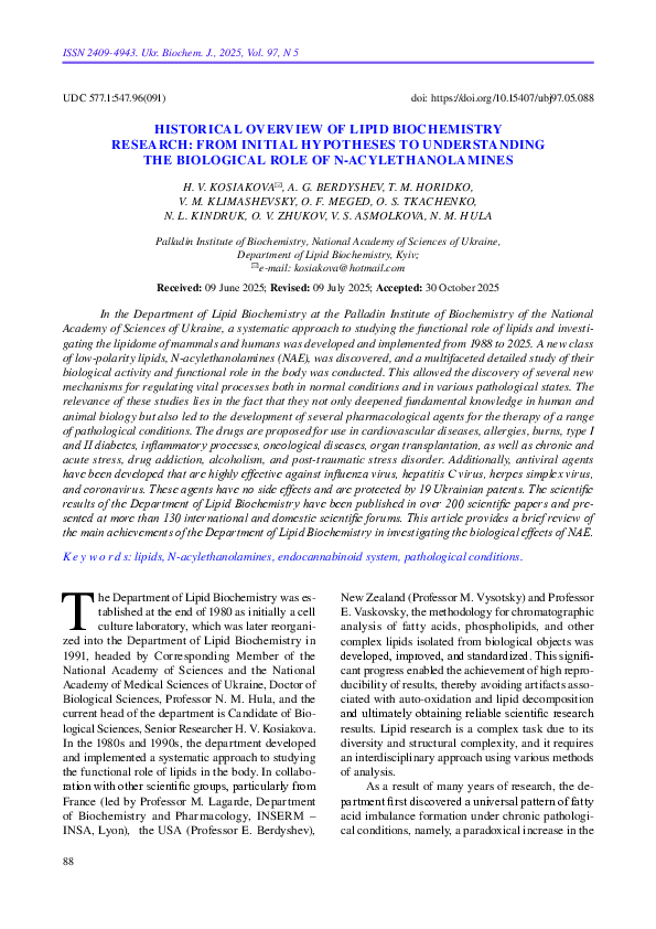 Kosiakova* H. V., Berdyshev A. G., Horidko T. M., Klimashevsky V. M., Meged O. F. , Tkachenko O. S., Kindruk N. L., Zhukov O. V. , Asmolkova V. S., Hula N. M. Historical overview of lipid biochemistry research: from initial hypotheses to understanding the biological role of N-acylethanolamines//Ukr.Biochem.J.- 2025. -V.97, N5. - P.88 - 101;