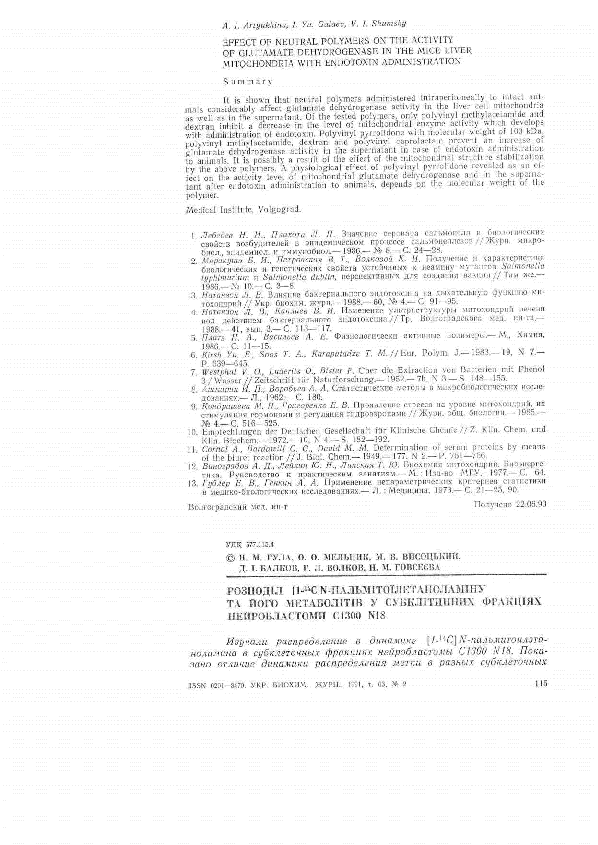 Волков Г. Л. Изучение межмембранного обмена липидов между клетками нейробластомы С1300 N18 и липосомами с помощью двойной изотопной метки // Укр. біохім. журн. -1989. -61, №6. -С.76-80.