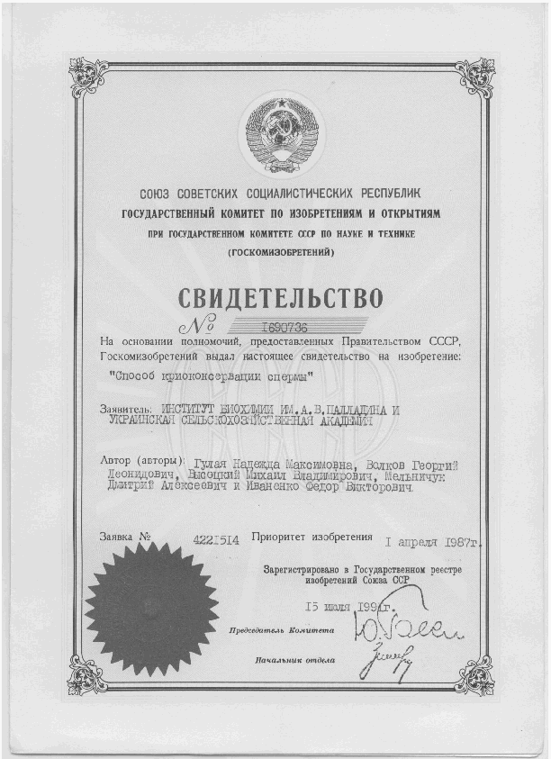 Волков Г.Л., Худякова Н.А., Говсеева Н.Н., Гулая Н.М. Характеристика липидного состава плазматической мембраны эритроцитов крупного рогатого скота // ДАН СССР. -1989, №7. -С.76-78.