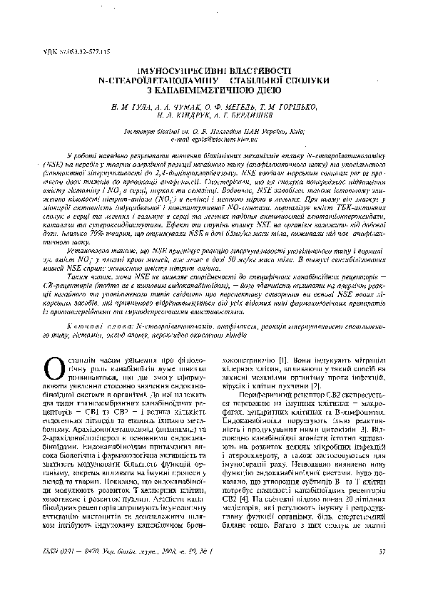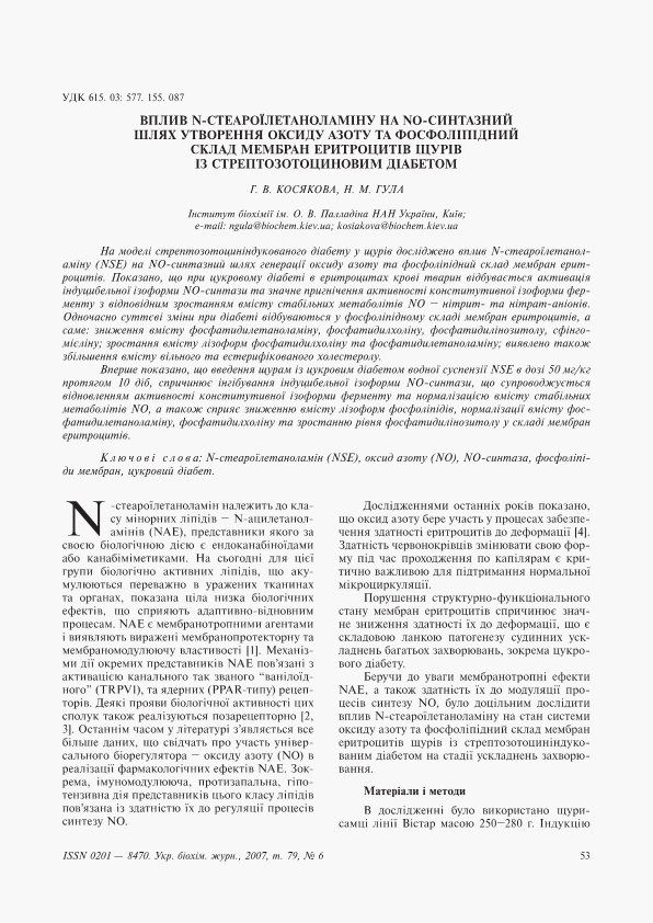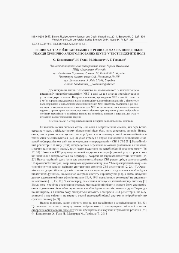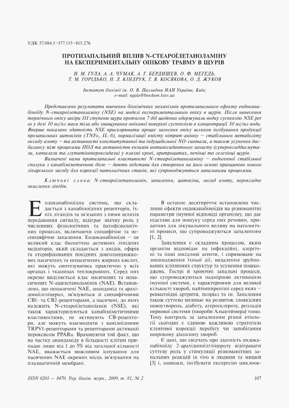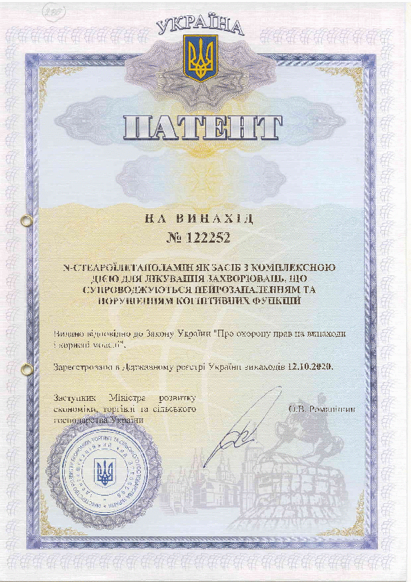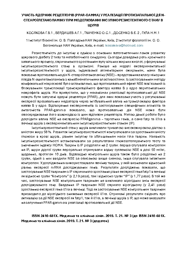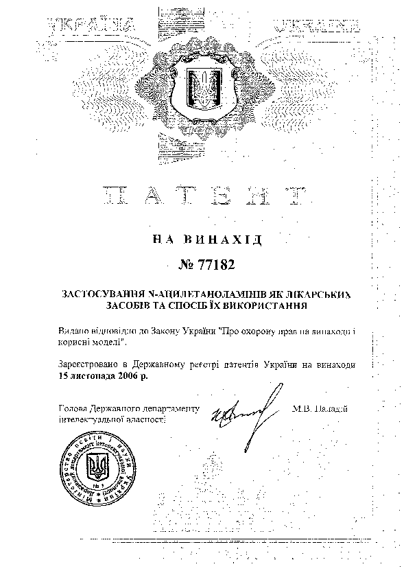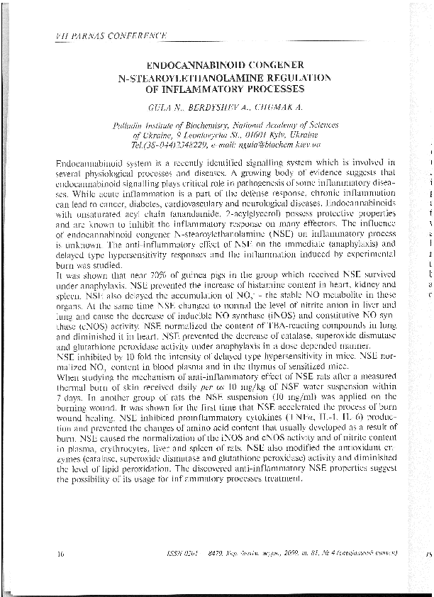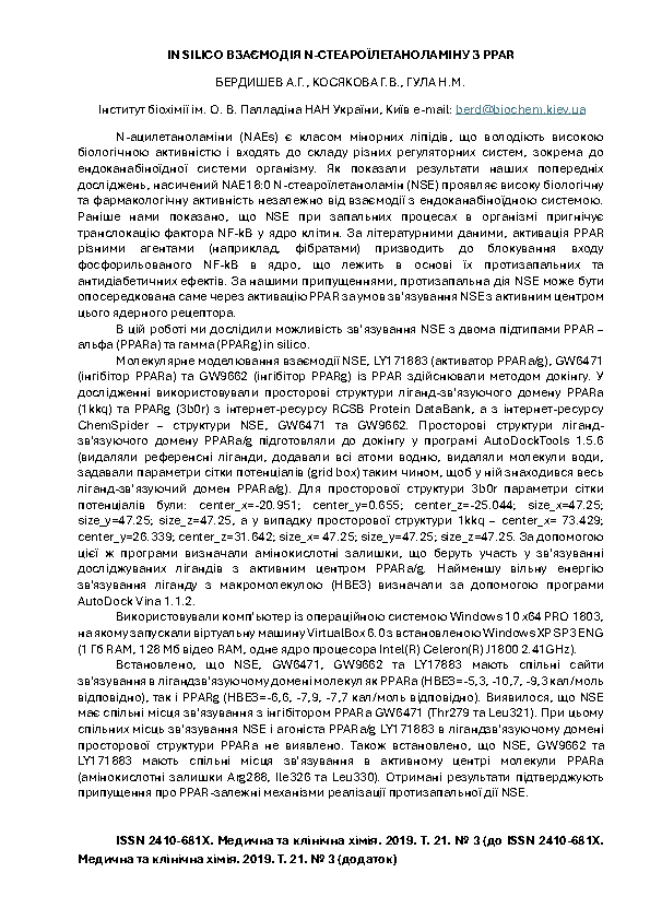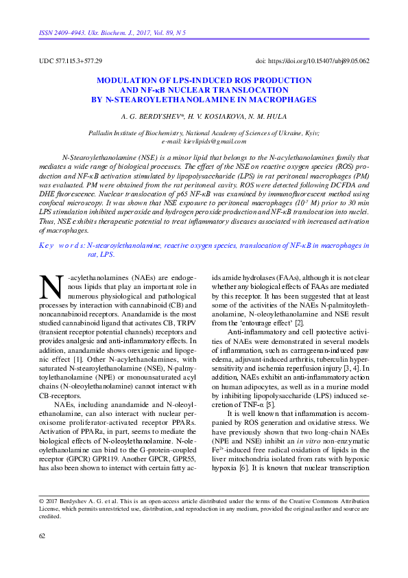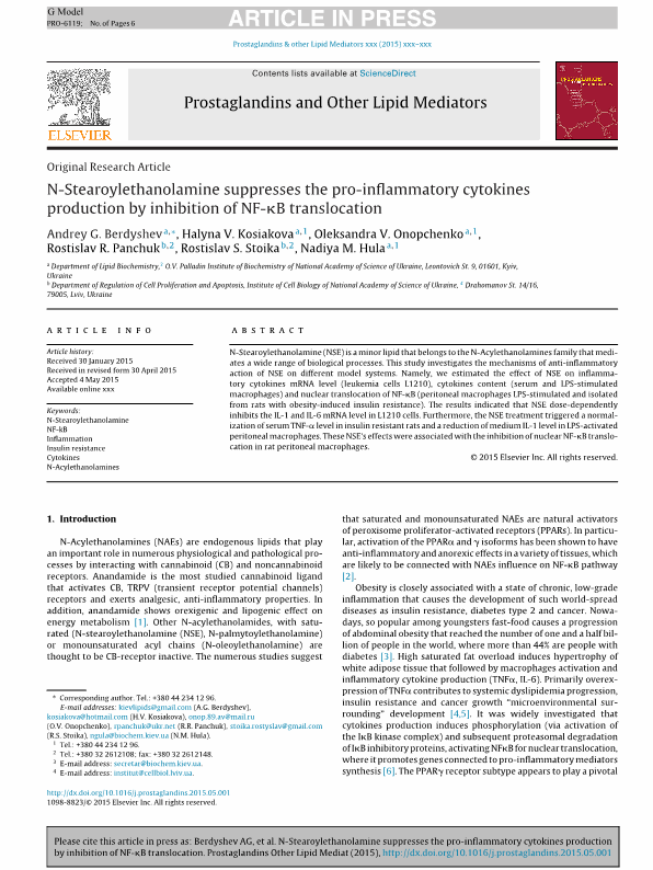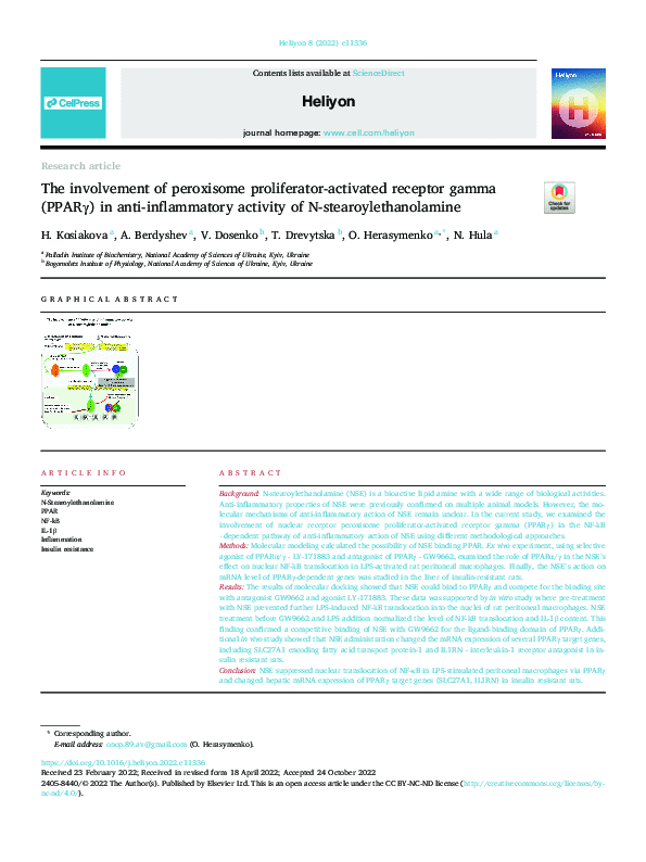 Kosiakova H., Berdyshev A., Dosenko V., Drevytska T., Herasymenko O., Hula N. The involvement of peroxisome proliferator-activated receptor gamma (PPARγ) in anti-inflammatory activity of N-stearoylethanolamine//Heliyon.- 2022. -V.8, N11. - E11336. .doi.org/10.1016/j.heliyon.2022.e11336