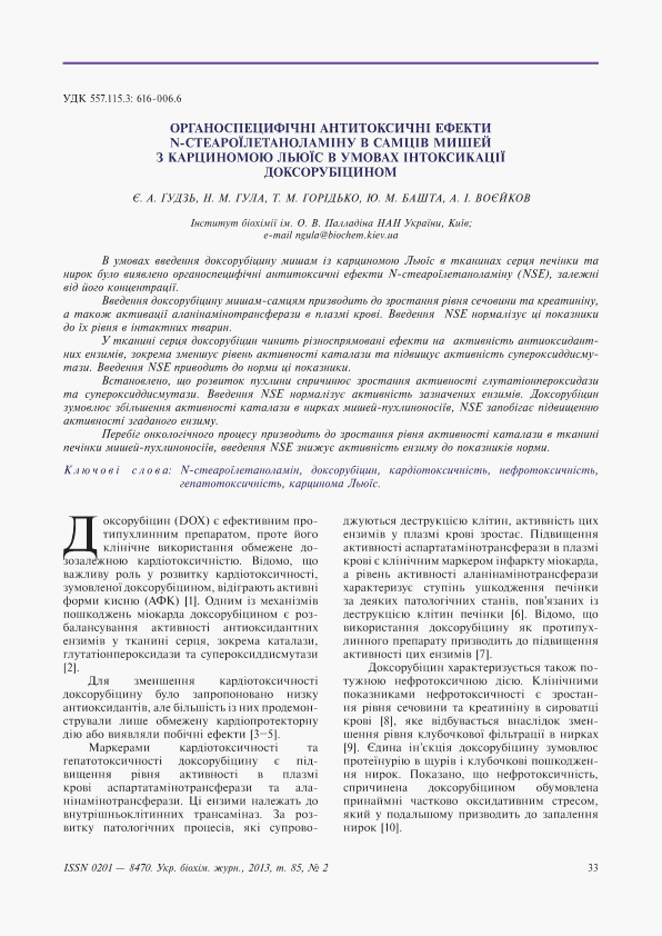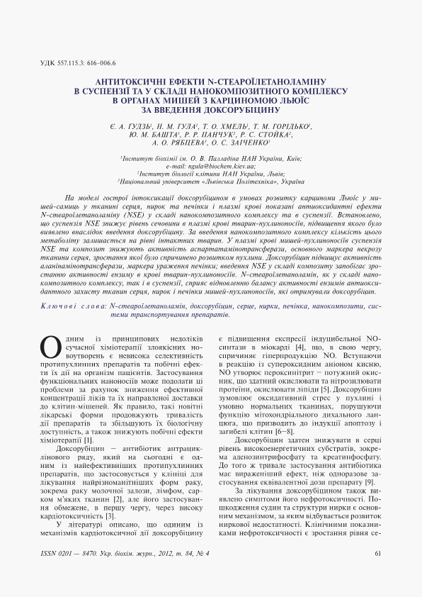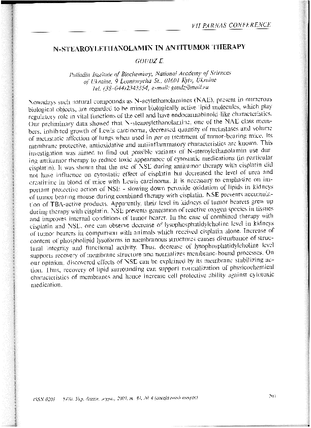 Tetyana Horid’ko, Iehor Hudz, Nadiya Hula, Anna Riabtseva, Nataliya Mitina, Alexander Zaichenko, Petra Heffeter, Walter Berger and Rostyslav Stoika Cannabimimetic N-Stearoylethanolamine as “Double-Edged Sword” in Anticancer Chemotherapy: Proapoptotic Effect on Tumor Cells and Suppression of Tumor Growth versus Its Bio-Protective Actions in Complex with Polymeric Carrier on General Toxicity of Doxorubicin In Vivo//Pharmaceutics.- 2023. -V.15- 835 - P.1 - 29. doi.org/10.3390/pharmaceutics15030835