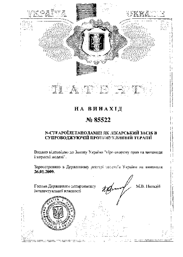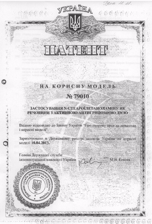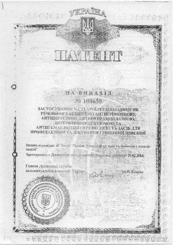 Hula NM, Chumak AA, Berdyshev AG, Kosiakova GV, Goridko TM, Meged’ OF, Asmolkova VS, Porva YuI, Rybalko SL, Dyadun ST, Starosyla DB, Deryabin OM. N-stearoylethanolamine - a new inhibitor of the hepatitis C virus reproduction.