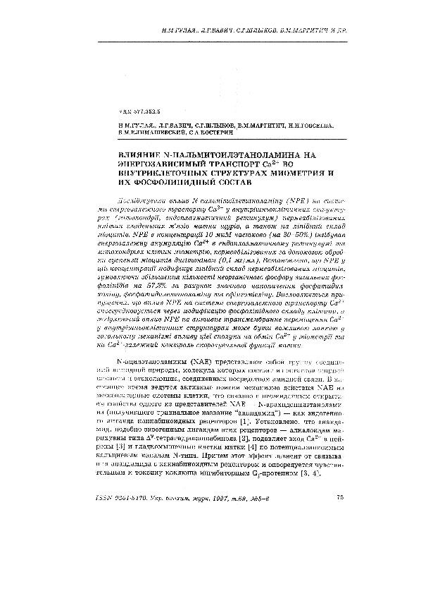 Мельник А. А., Говсеева Н. Н., Волков Г. Л., Гулая Н. М. Влияние миристоил-, пальмитоил-, стеароилєтаноламинов на проницаемость мембраны клеток нейробластомы С1300 N18 для одновалентных катионов // ДАН СССР. -1989, №5. -С.72-74.