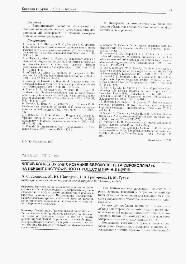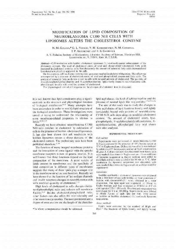 Гулая Н. М., Волков Г. Л., Говсеева Н. Н., Артеменко И. П. Модификация липидного состава клеток нейробластомы С1300 с помощью липосом // Укр. біохім. журн. -1986. -58, №1. -С.39-43.
