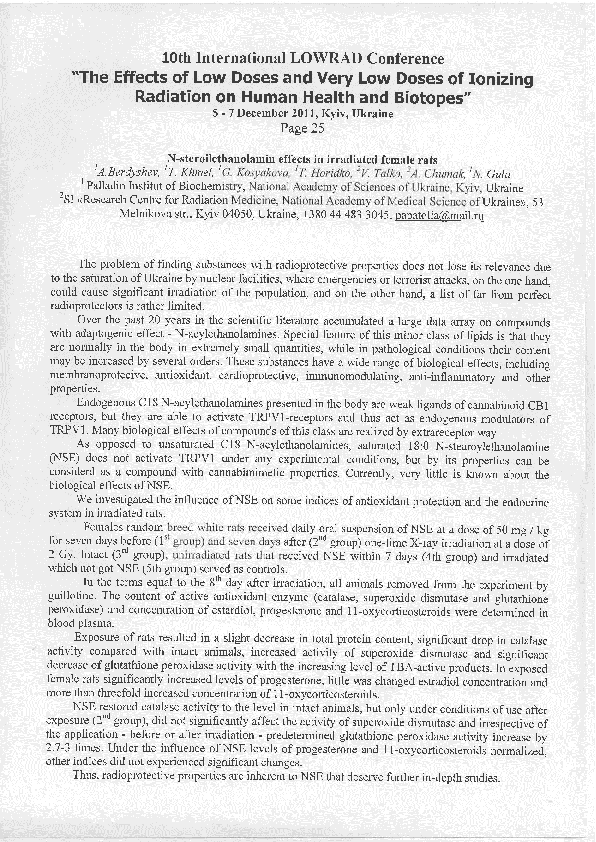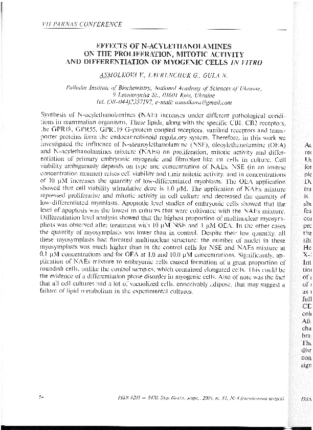 Гулая Н. М., Волков Г. Л., Мельник А. А., Артеменко И. П., Говсеева Н. Н. Влияние N-ацилэтаноламинов на транспорт одновалентных катионов в плазматической мембране клеток нейробластомы С1300 // Междунар. семинар "Транспорт ионов и механизм его регуляции", Тбилиси, 14 ноября 1989 г