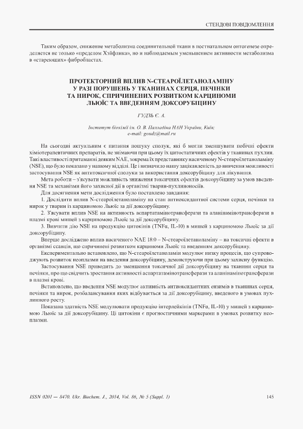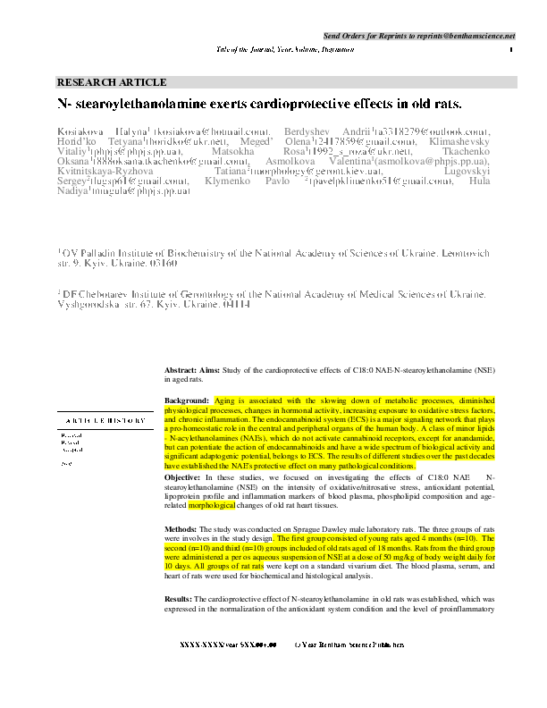 Kosiakova H, Berdyshev A, Horid'ko T, Meged' O, Klimashevsky V, Matsokha R, Tkachenko O, Asmolkova V, Kvitnitskaya-Ryzhova T, Lugovskyi S, Klymenko P, Hula N., N-Stearoylethanolamine Exerts Cardioprotective Effects in Old Rats.//Curr Aging Sci.-2024. -V.17, N2. - P.144-155. DOI: 10.2174/0118746098275323231226073348