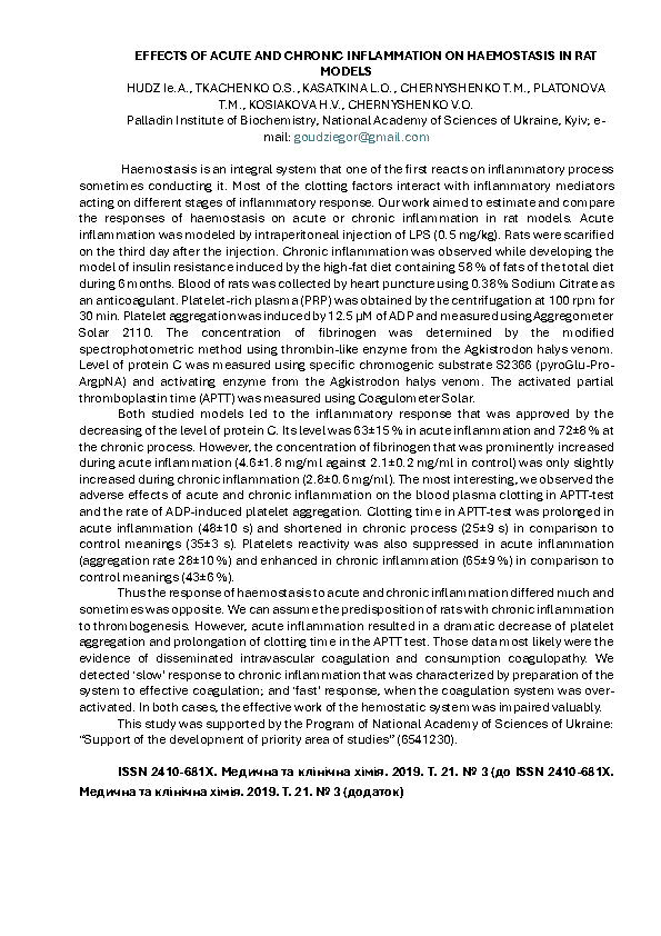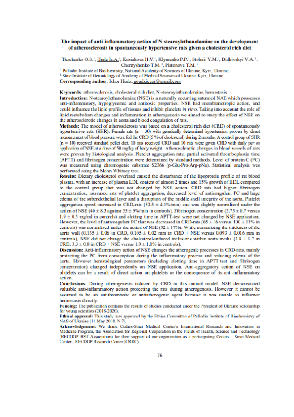 Hudz Ie, Chernyshenko V,. Kasatkina L, Urvant, Klimashevskyi V., Tkachenko O., Kosiakova H., Hula N. and Platonova T. N-stearoylethanolamine inhibits integrin-mediated activation, aggregation and adhesion of human platelets//Journal of Pharmacology and Experimental Therapeutics.- 2022. -V.383, N1. - P.2 - 10. DOI: https://doi.org/10.1124/jpet.122.001084