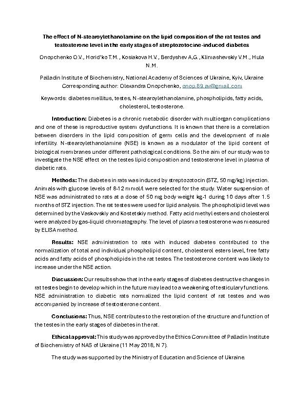 Tkachenko O., Horidko T., Kosiakova H. The Effect of N-stearoylethanolamine on Blood PPARγ, Cytokines Levels and Fatty Acid Composition of Brain Structures in Aged Rats with Chronic Inflammation . 20th RECOOP Bridges in Life Sciences Conference April 2 - 3, 2025 Prague, Czech Republic //Booklet 20th Bridges in Life Sciences Prague, April 2-3, 2025.- 2025. - P.16 .