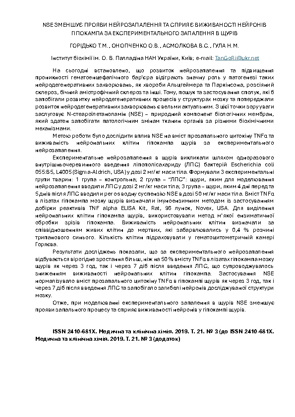 Kosyakova H.V., Goridko T.M., Berdyshev A.G., Dyadyun S.T., Asmolkova V.S. , Starosila D.B., Porva Y.I., Chumak A.A., Ribalko S.L., Hula N.M. Prospects for the use of N-stearoylethanolamine as an effective antiviral agent for the pharmacotherapy of herpes infection caused by human herpes simplex virus. Тезисы докладов участников Международной научной конференции "Физико-химическая биология как основа современной медицины", посвященной 75-летию со дня рождения профессора Е. В. Барковского Минск, 21 мая 2021 г. / Белорусский государственный медицинский университет, Минск.Минск: из-во БГМУ. -2021 .-c. 147-149.
