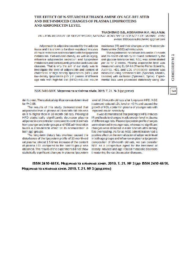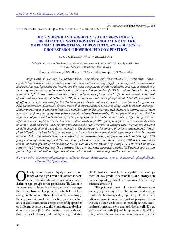 Tkachenko O. S., Kosiakova H. V. Diet-induced and age-related changes in rats: the impact of N-stearoylethanolamine intake on plasma lipoproteins, adiponectin, and adipocyte cholesterol-phospholipid composition //Ukr. Biochem. J..- 2024. -V.96, N2. - P.84 - 99.doi: https://doi.org/10.15407/ubj96.02.084