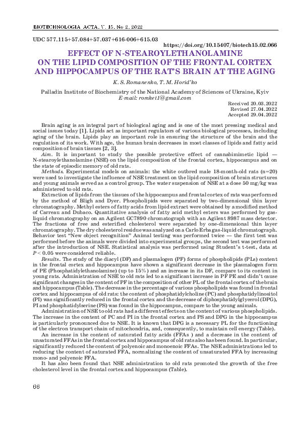 Romanenko, K S; Horid'ko, T M. Еffect of N-stearoylethanolamine on the lipid composition of the frontal cortex and hippocampus of the rat's brain at the aging//Biotechnologia Acta.- 2022. -V.15, N2. - P.66 - 67. DOI:10.15407/biotech15.02.066.