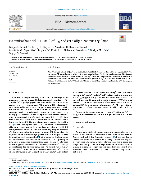 Babich, L. G., Shlykov, S. G., Bavelska-Somak, A. O., Zagoruiko, A. G., Horid’ko, T. M., Kosiakova, H. V., Hula, N. M. та Kosterin, S. O., (2023). Extramitochondrial ATP as [Ca2+]m and cardiolipin content regulator. Biochimica et Biophysica Acta (BBA) - Biomembranes [онлайн]. 184213. doi: 10.1016/j.bbamem.2023.184213