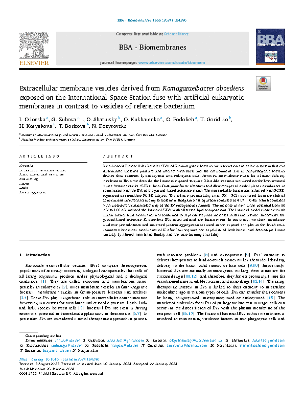 Orlovska I, Zubova G, Shatursky O, Kukharenko O, Podolich O, Gorid'ko T, Kosyakova H, Borisova T, Kozyrovska N. Extracellular membrane vesicles derived from Komagataeibacter oboediens exposed on the International Space Station fuse with artificial eukaryotic membranes in contrast to vesicles of reference bacterium //Biochim Biophys Acta Biomembr.- 2024. -V.1866, N3. - P.184290. doi: 10.1016/j.bbamem.2024.184290. Epub 2024 Jan 26. PMID: 38281706.