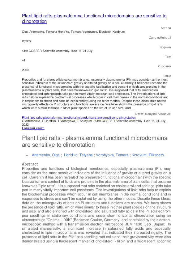Artemenko O, Horid'ko T, Vorobyova T, Kordyum E. Plant lipid rafts-plasmalemma functional microdomains are sensitive to clinorotation//44th COSPAR Scientific Assembly. Held 16-24 July.- 2022. -V.44, - P.2909.