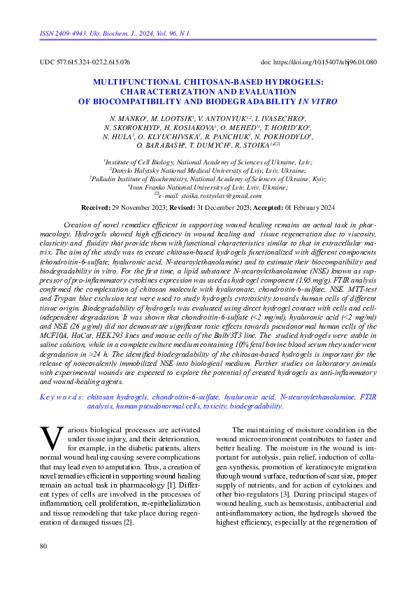 Manko N., Lootsi M., Antonyuk V., Ivasechko I., Skorokhyd N., Kosiakova H., Mehed’ O., Horid’ko T., Hula N,, Klyuchivska O., Panchuk R., Pokhodylo N., Barabash O., Dumych T., Stoika R. Multifunctional chitosan-based hydrogels: characterization and evaluation of biocompatibility and biodegradability in vitro //Ukr. Biochem. J..- 2024. -V.96, N1. - P.80 - 95. DOI:10.15407/ubj96.01.080