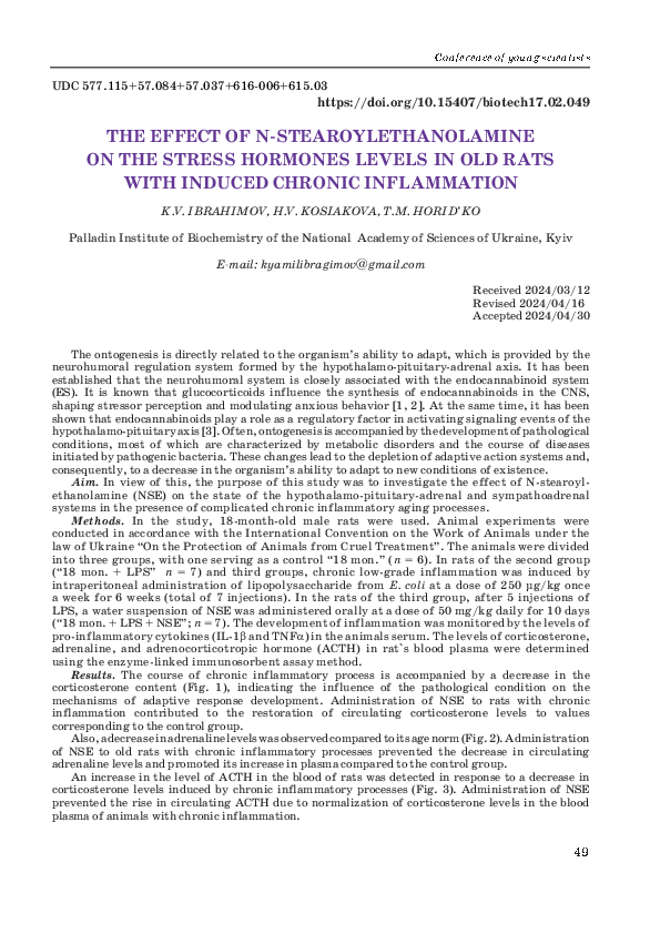 Ibrahimov K.V., . Kosiakova H.V, Horid’ko T.M. The effect of N-stearoylethanolamine on the stress hormones levels in old rats with induced chronic inflammation // Biotechnologia Acta.- 2024. -V.17, N2. - P.49 - 51. https://doi.org/10.15407/biotech17.02.049