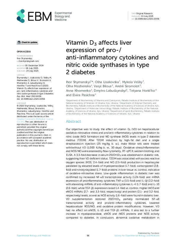 Shymanskyi I., Lisakovska O., Veliky M., Mezhenska P., Bilous V., Siromolot A., Khomenko A., Labudzynskyi D., Horid’ko T., Pasichna E. Vitamin D3 affects liver expression of pro-/anti-inflammatory cytokines and nitric oxide synthases in type 2 diabetes //Experimental Biology and Medicine.- 2025. - 250:10456.