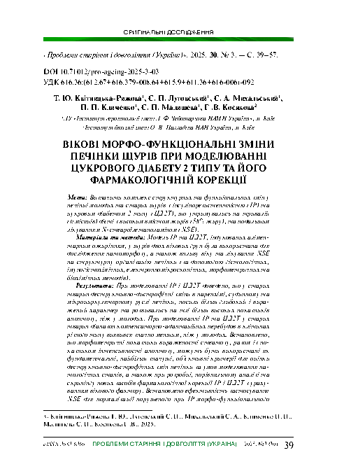 Kvitnitskaya-Ryzhova T. Yu., Lugovskoy S. P. , Mykhalskiy S. A., Klymenko P. P., Malysheva S. P. , Kosiakova H. V. Age-related morpho-functional changes in rats’ liver in modeling type 2 diabetes and its pharmacological correction//Problems of ageing and longevity (Ukraine).- 2025. -V.30, N3. - P.39 - 57. https://pro-ageing.org.ua/index.php/journal/article/view/55/40