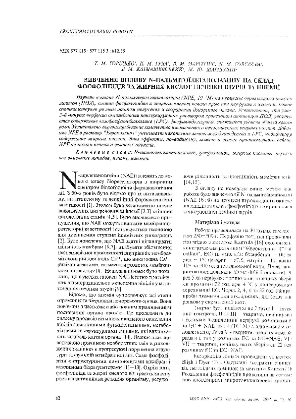 Горідько Т.М., Косякова Г.В., Бердишев А.Г., Клімашевський В.М., Химорода Я.П. Вплив N-стеароїлетаноламіну на ліпідний склад печінки щурів за умов його профілактичного застосування при моделюванні аліментарного ожиріння//Проблеми та досягнення сучасної біотехнології: матеріали ІV міжнародної наук.-практ. інтернет-конф. (22 березня 2024 р., м. Харків). – Електрон. дані. – Х. : НФаУ.- 2024. -P.202 - 203.